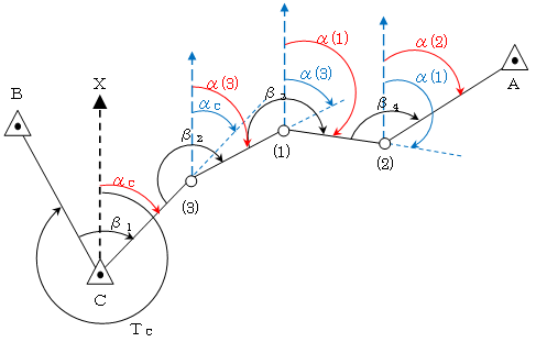 図より、新点(2)における既知点Aへの方向角(α2)を求めるには、αCから順番に方向角を求めればよい。